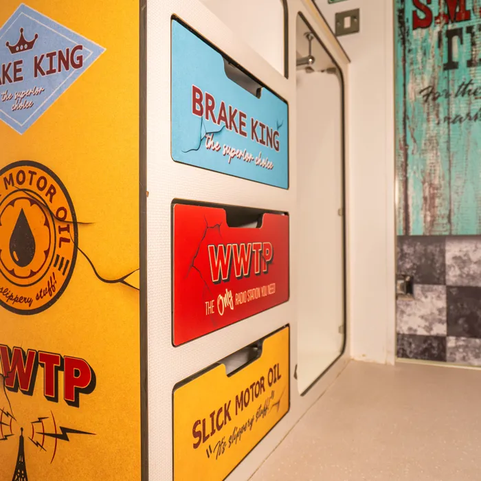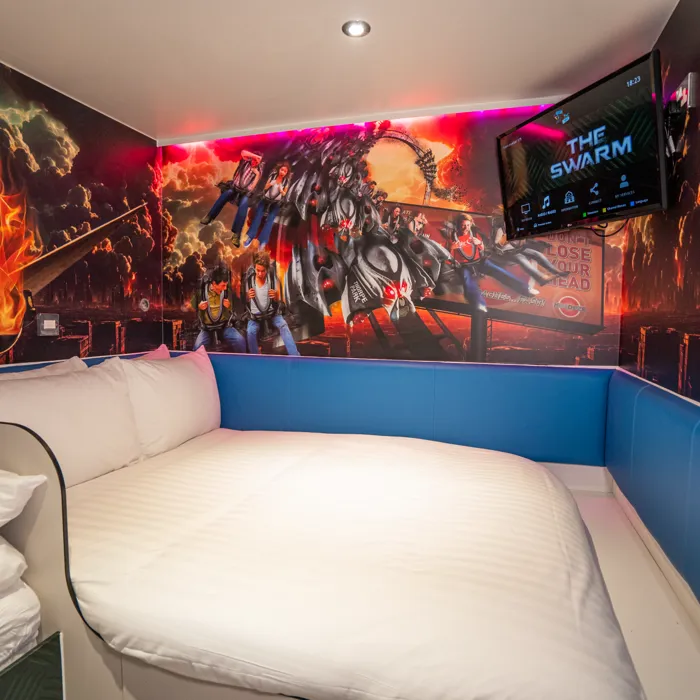 Stay in Swarm-themed cabins inspired by The Swarm rollercoaster, immersing you in a post-apocalyptic adventure for your short stay