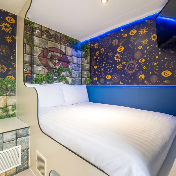 Quirky, compact, and oh-so-cosy, our theme park hotel is perfect for an epic theme park holiday or UK short break. Each cabin is packed with all the essentials you need for an unforgettable staycation, including a super comfy double bed and bunk bed, an interactive TV with Freeview and Thorpe Park info channels, bottled water, hot drink making facilities and colour-changing mood lighting.