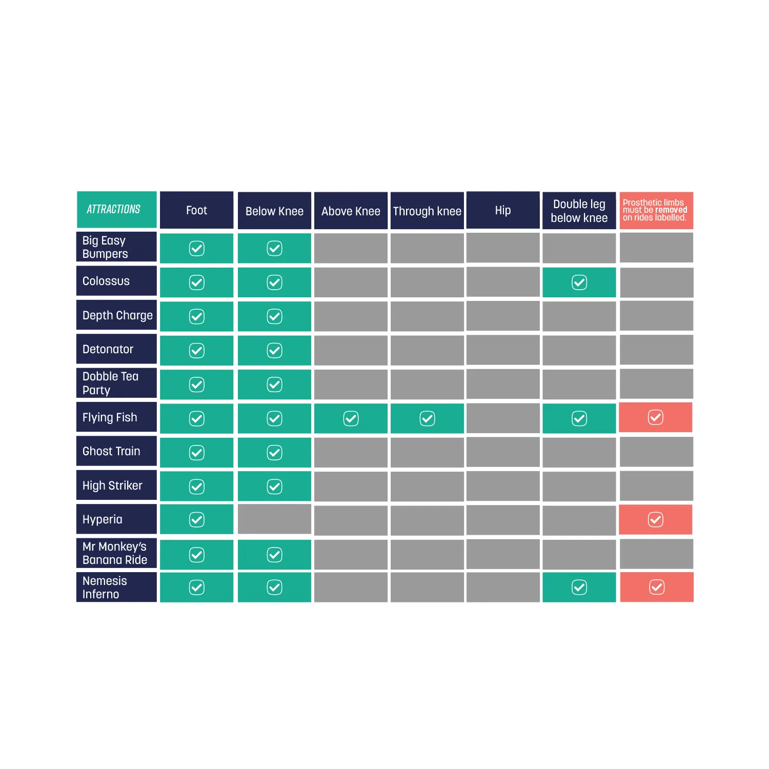 Please note that if you have two leg limb differences, you are required to have a prosthetic that can be brought to you in the case of an evacuation. Please speak with a member of the Guest Services team or contact us ahead of your visit for more information.