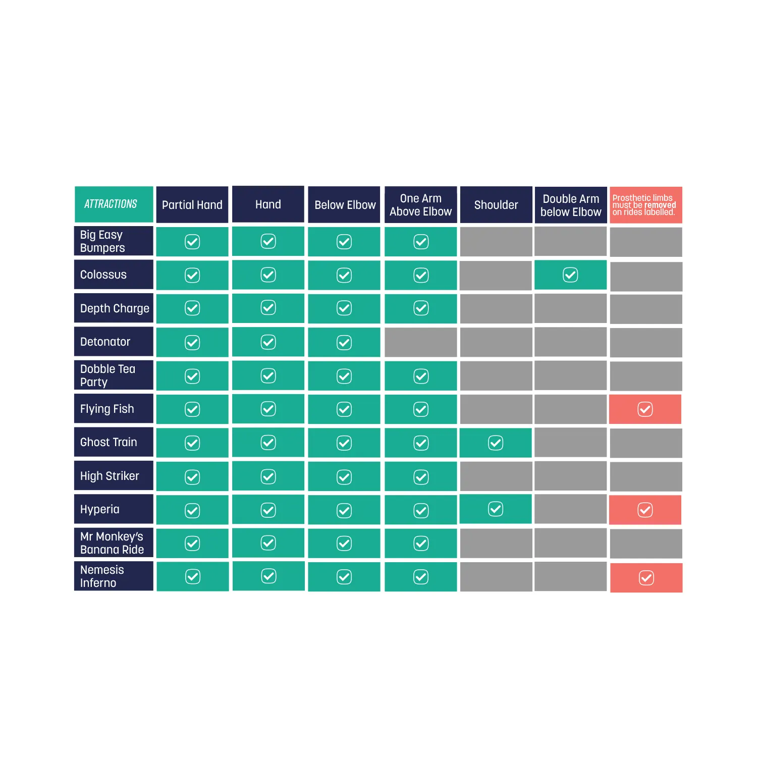 Prosthetic limbs must be removed on the following rides before